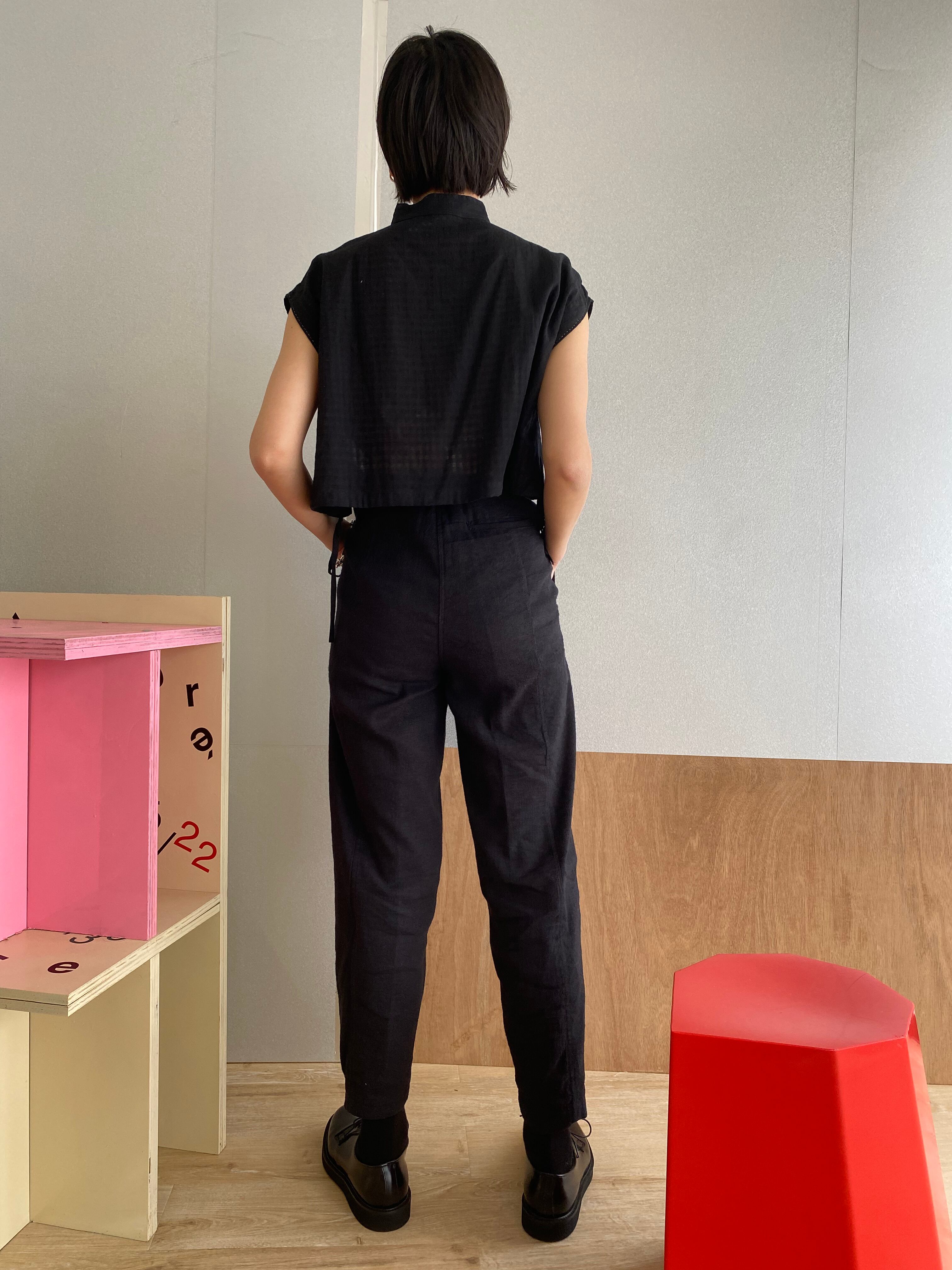ハイウエストパンツ。ウエスト周りはタイトめな作りですが、お尻周りやもも部分はゆとりがあり動きやすく履きやすい仕上がり。 パターンが後ろから前に向かってねじれるような形で作ってあります。野暮ったくならないように裾周りはテーパードしてあり、 デザインにひねりがありながら上品な印象です。全面に裏地がついています。透け感があり涼しげ。裏地の処理は全てパイピング仕上げ。インドの職人による手織りの生地を使用しています。カジュアルな印象の素材をモダンで上品な服に昇華させたデザインは、手仕事の形跡を際立たせ、着る人にリラックスしながらも上質な日常をもたらします。