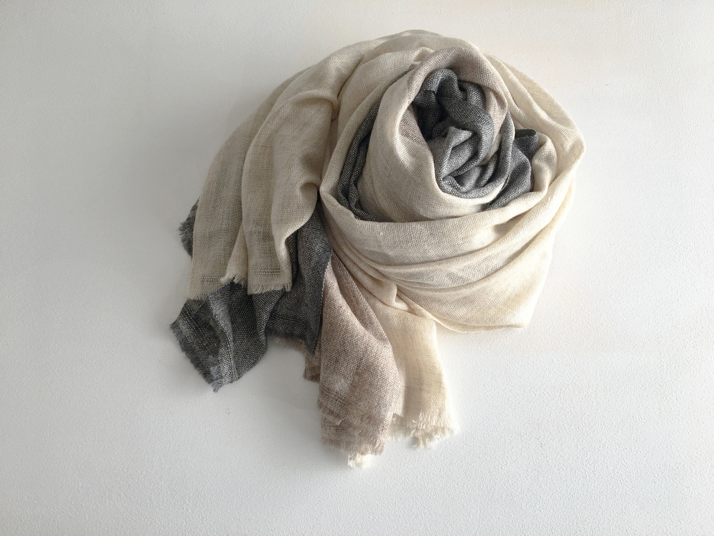 ウールとは思えないくらい軽く柔らかで冬の首元を暖かく、スタイリングに幅をもたらしてくれます。こちらのショールは巻き方により表にでる色が変わります。