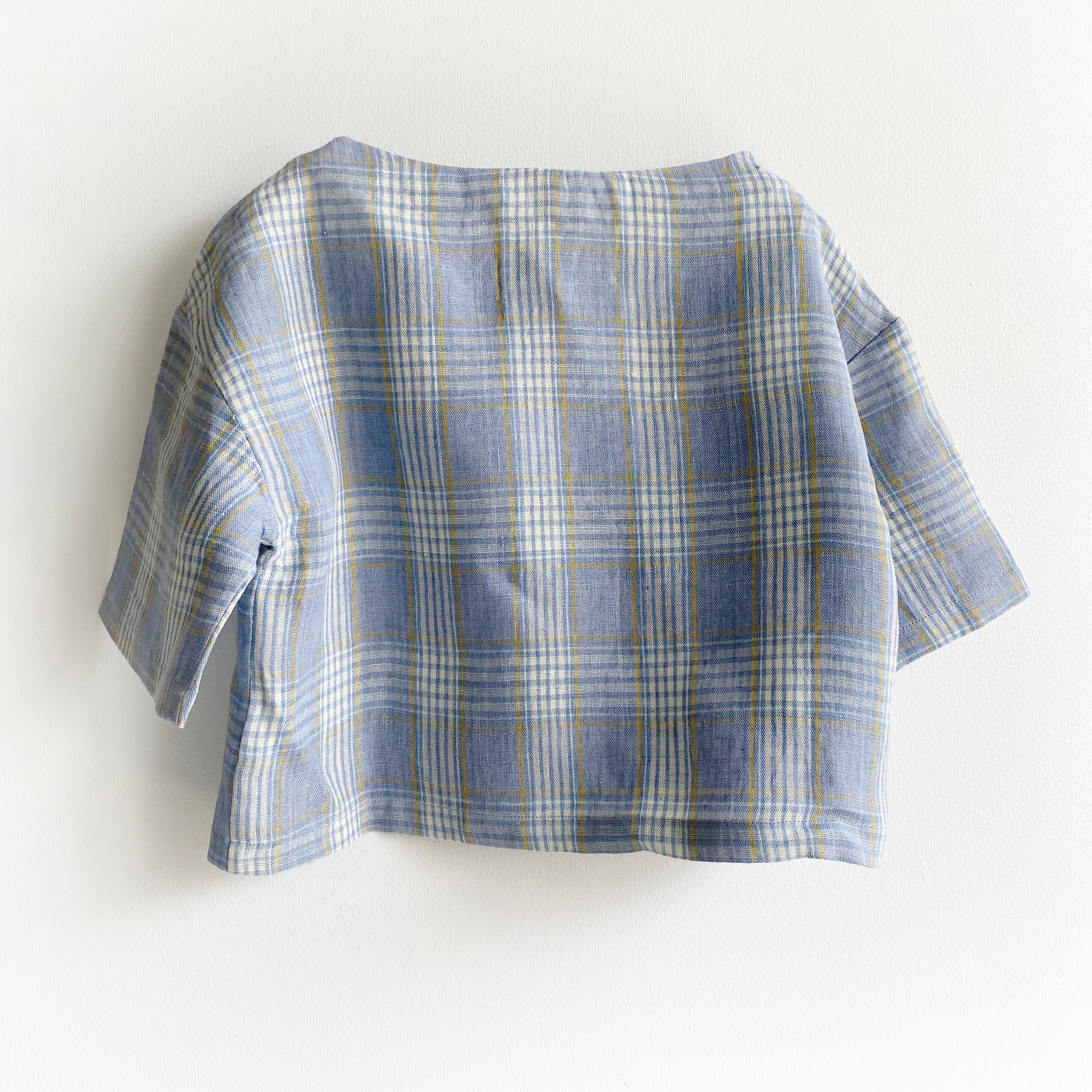先染めのサックスブルーベースに、ホワイトとアクセントカラーのイエローの映えるチェック柄のカディで仕立てたトップス。さらりとした肌ざわりとやさしい風合いが特長です。