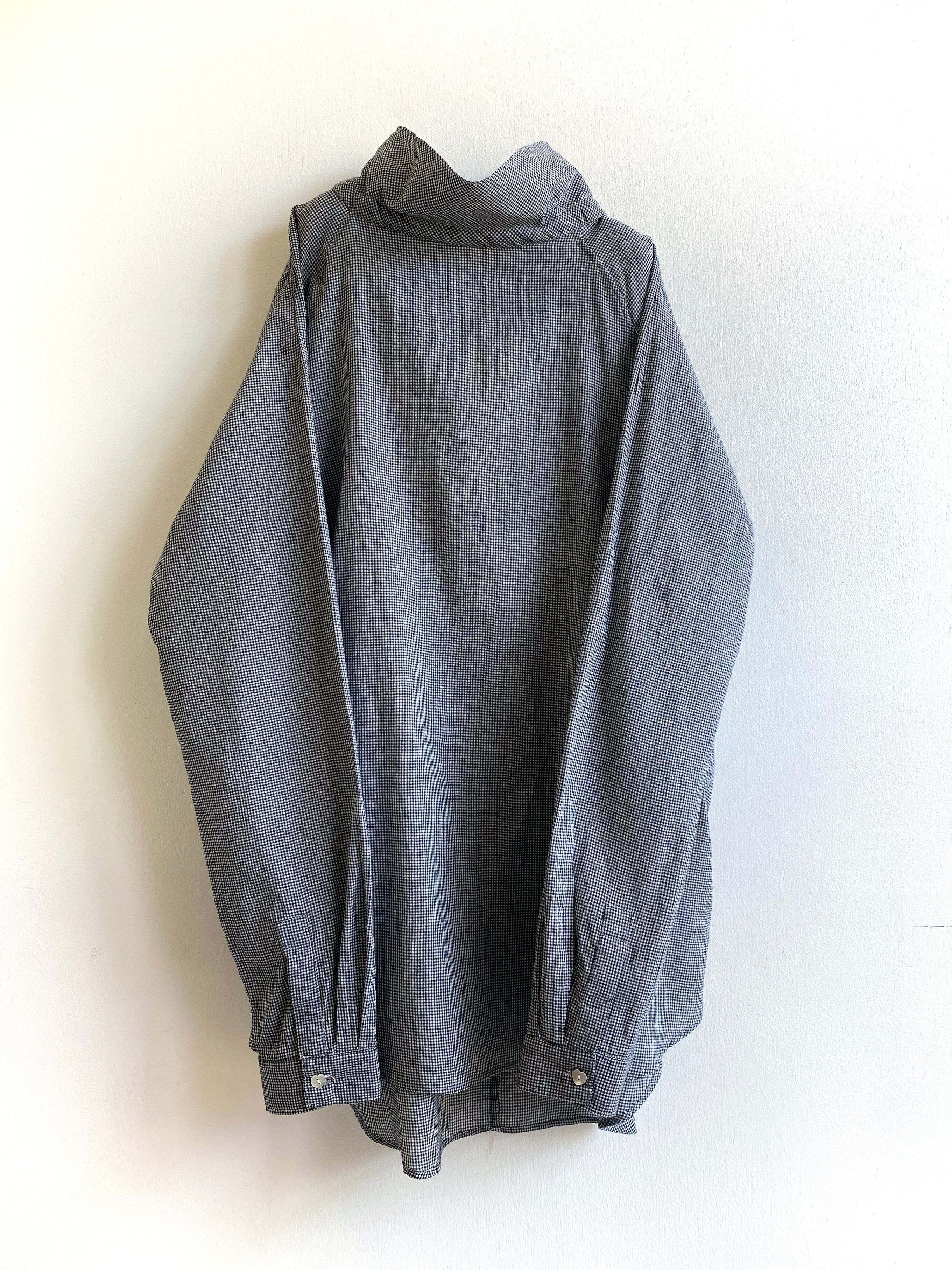 ゆったりとしたサイズ感のハイネックブラウス。長めのネックはリボンでギャザーを寄せたり、折って寝かせたりとスタイリングにより表情の変化を楽しめます。着丈は長めで、ボトムに入れ込む着こなしなど様々なコーディネートにお使いいただけます。薄手で非常に柔らかな生地感ですので、セーターの下などへの重ね着も可能です。襟とカフスにはシルバーの糸でハンドステッチが施されており、さり気なく煌めきます。