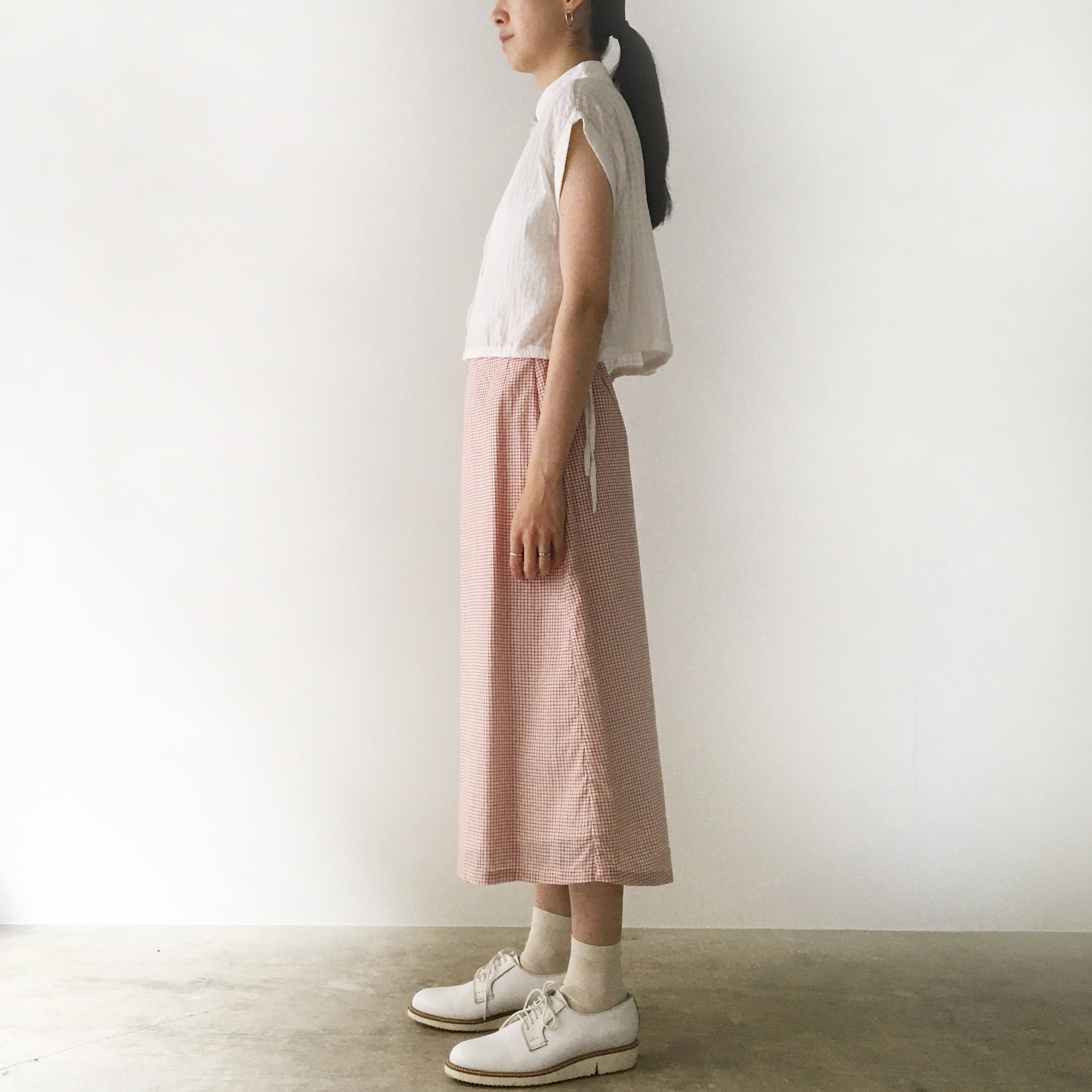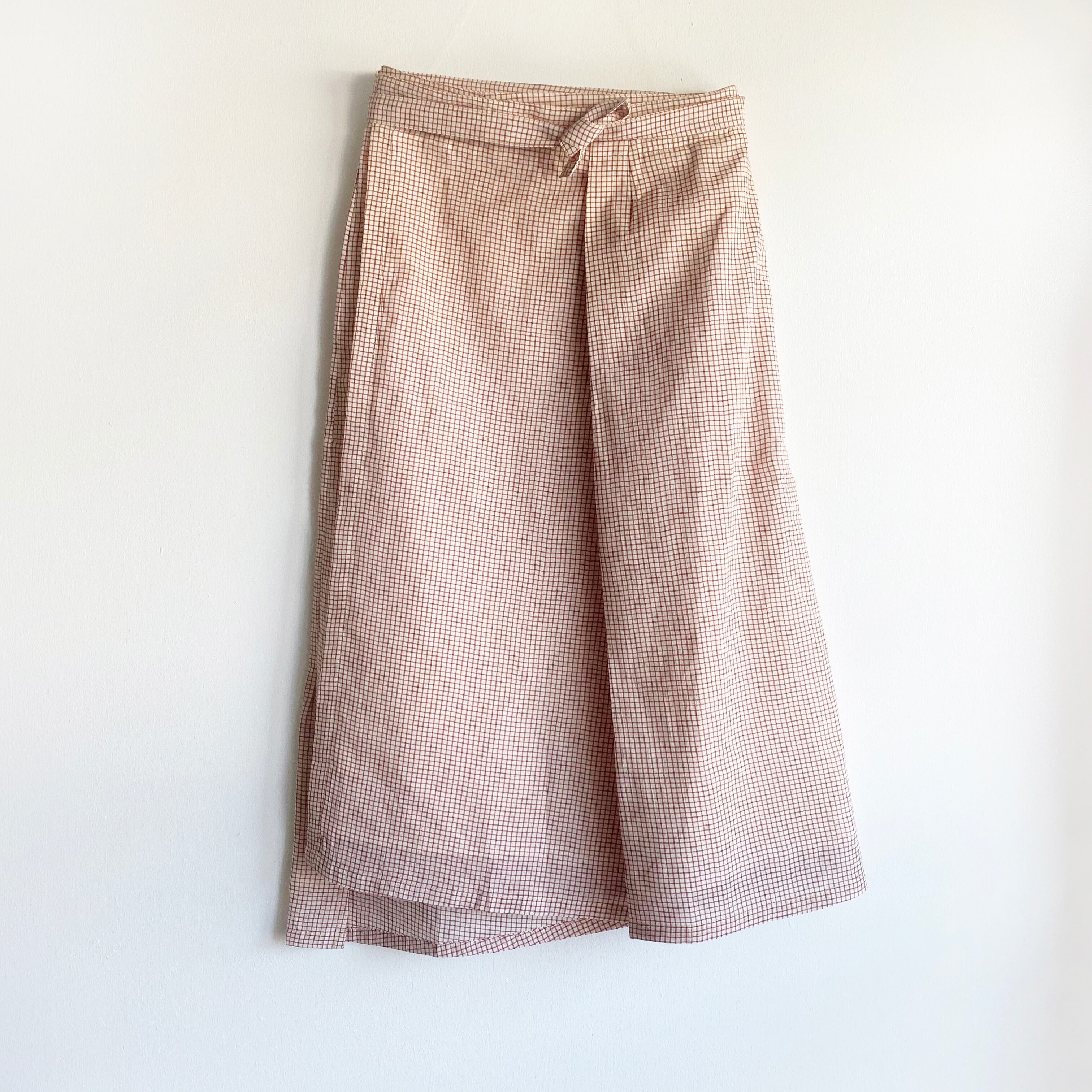 フロントの大胆なタックがアクセントのラップスカート。左右で丈が異なるアンシンメトリーなデザインで巻き方により印象が変化します。ウエスト部のダーツにより体に綺麗に沿うシルエットとなり、ラップタイプながらも安定感があります。裾に向かって少し広がるAラインシルエットは動きやすく、コンパクトなラインを描きますが、ゆとりのある着心地です。肌の露出が少ないスリットが施されており、上品にお使いいただけます。、コーディネートによってカジュアルにも、スタイリッシュにも着て頂けます。裏地には機械織オーガニックコットンタイプライターを使用。