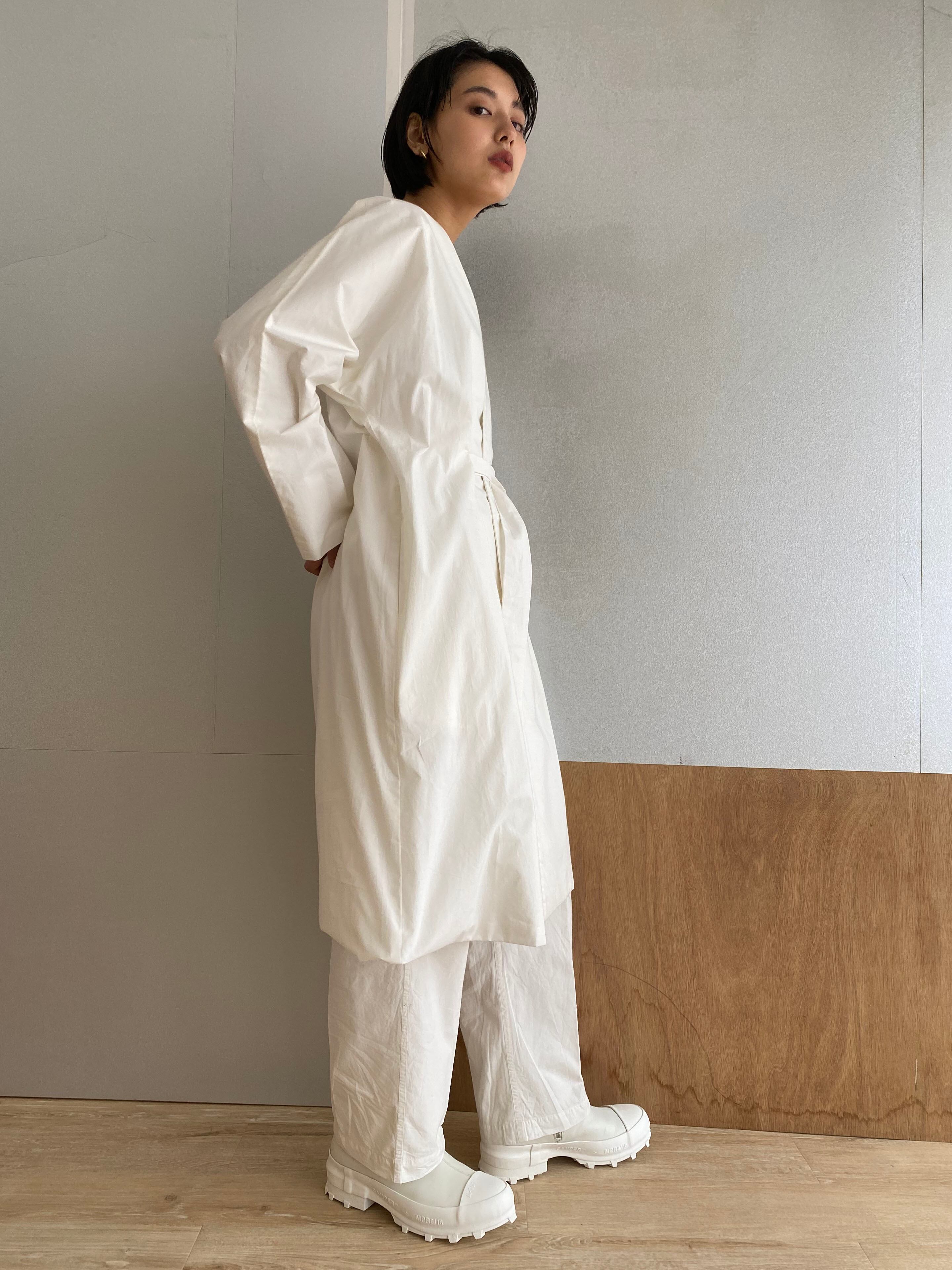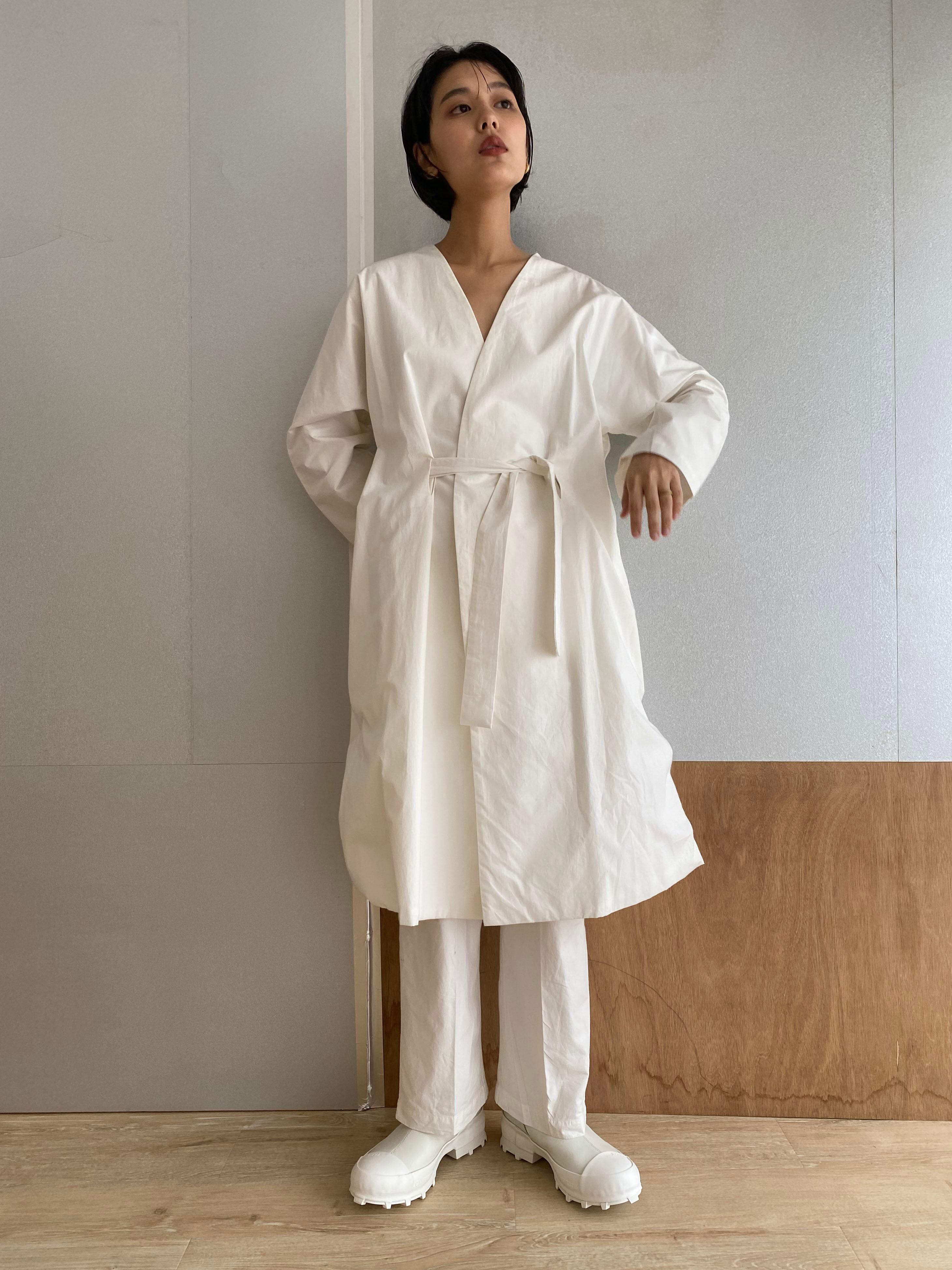 シンプルなデザインながら、ウエストのベルトが全体のバランスをグッと引き締めるコート。ベルトは裏地に通っているため、後ろ姿がすっきりします。ベルトを引く事で前身頃にタックが入ったようなラインが出て、独特の雰囲気を楽しんでいただけます。様々なシーズンに活躍しそうな一枚。光沢感のあるコットン生地が品の良さを感じさせます。