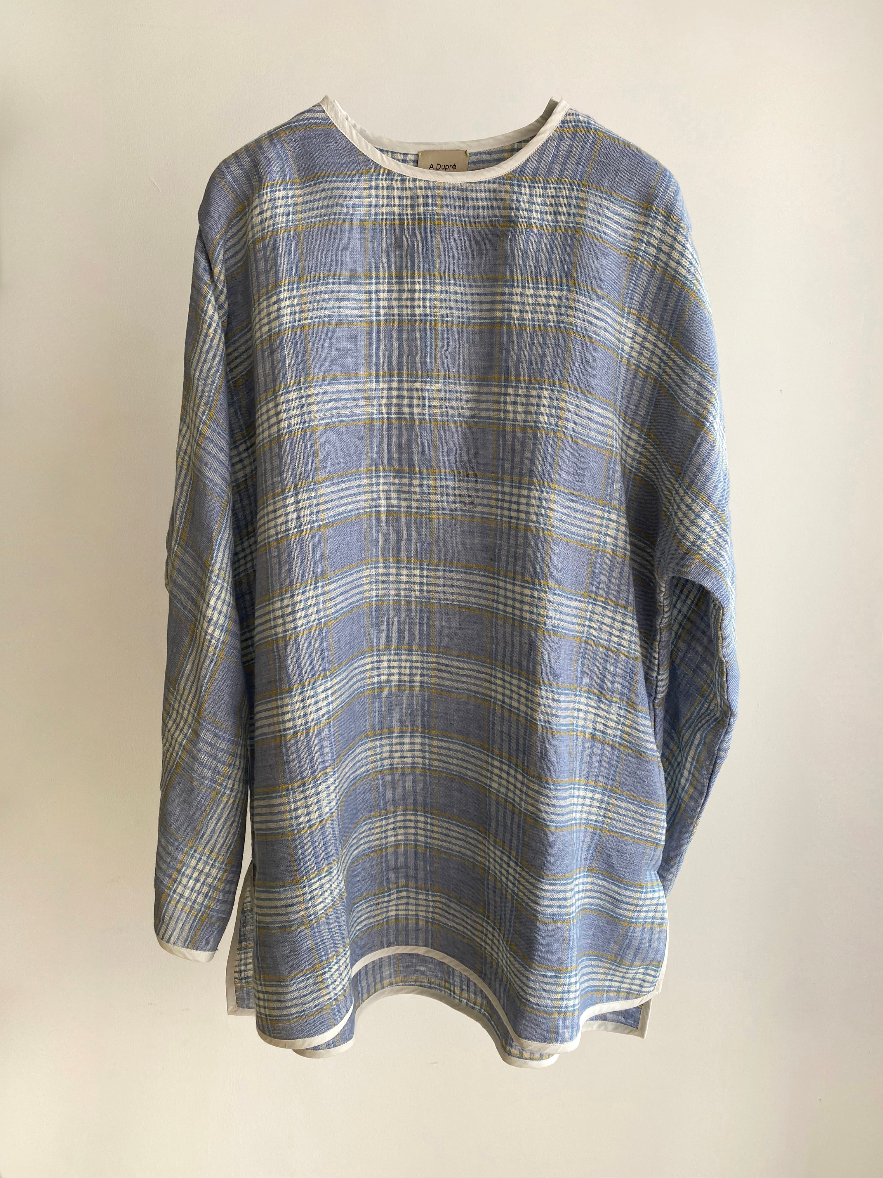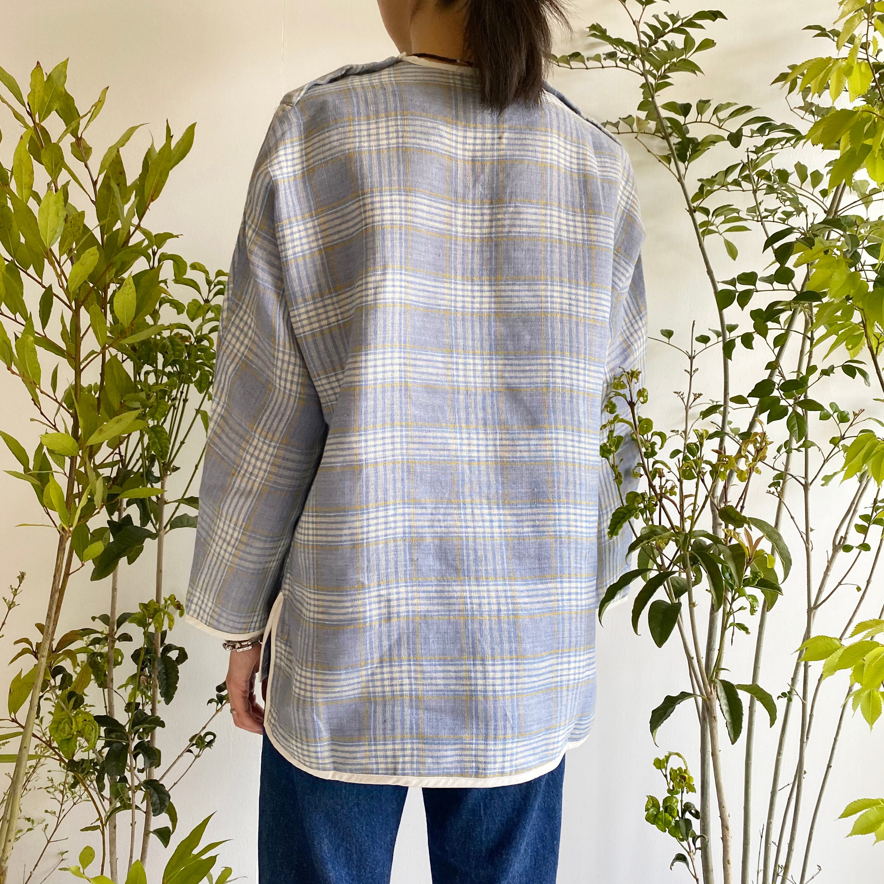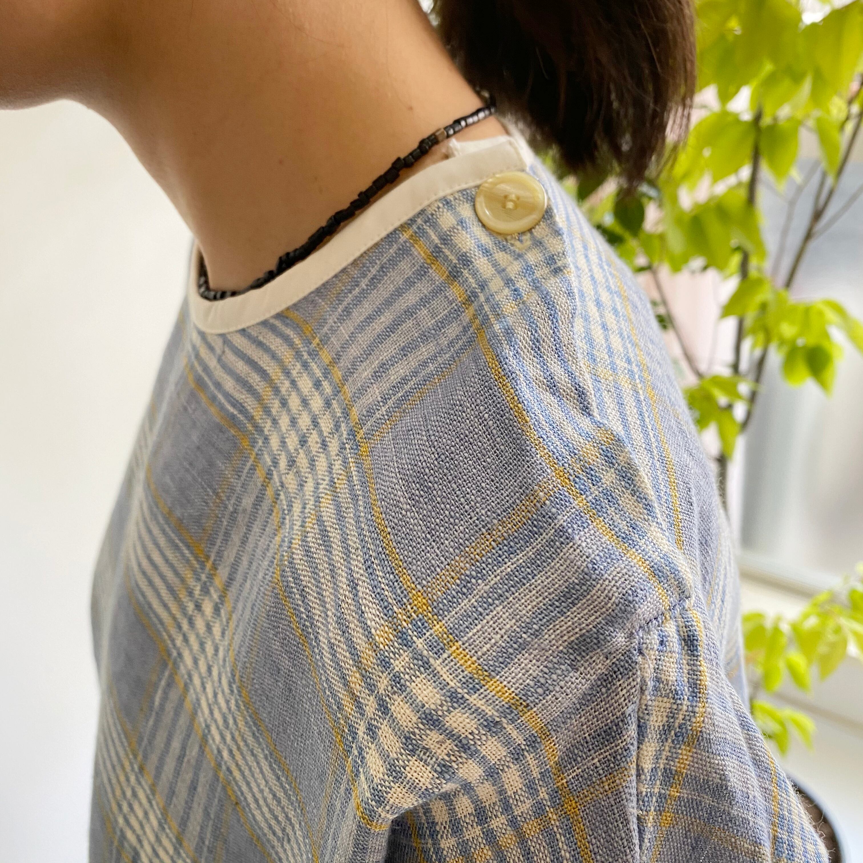 ゆったりとしたサイズ感のプルオーバー。肩に施されたボタンがアクセントになっています。パイピングがデザインのアクセントに。リネンの素材を使用しており、程よいハリ感があり柔らかな風合いです。