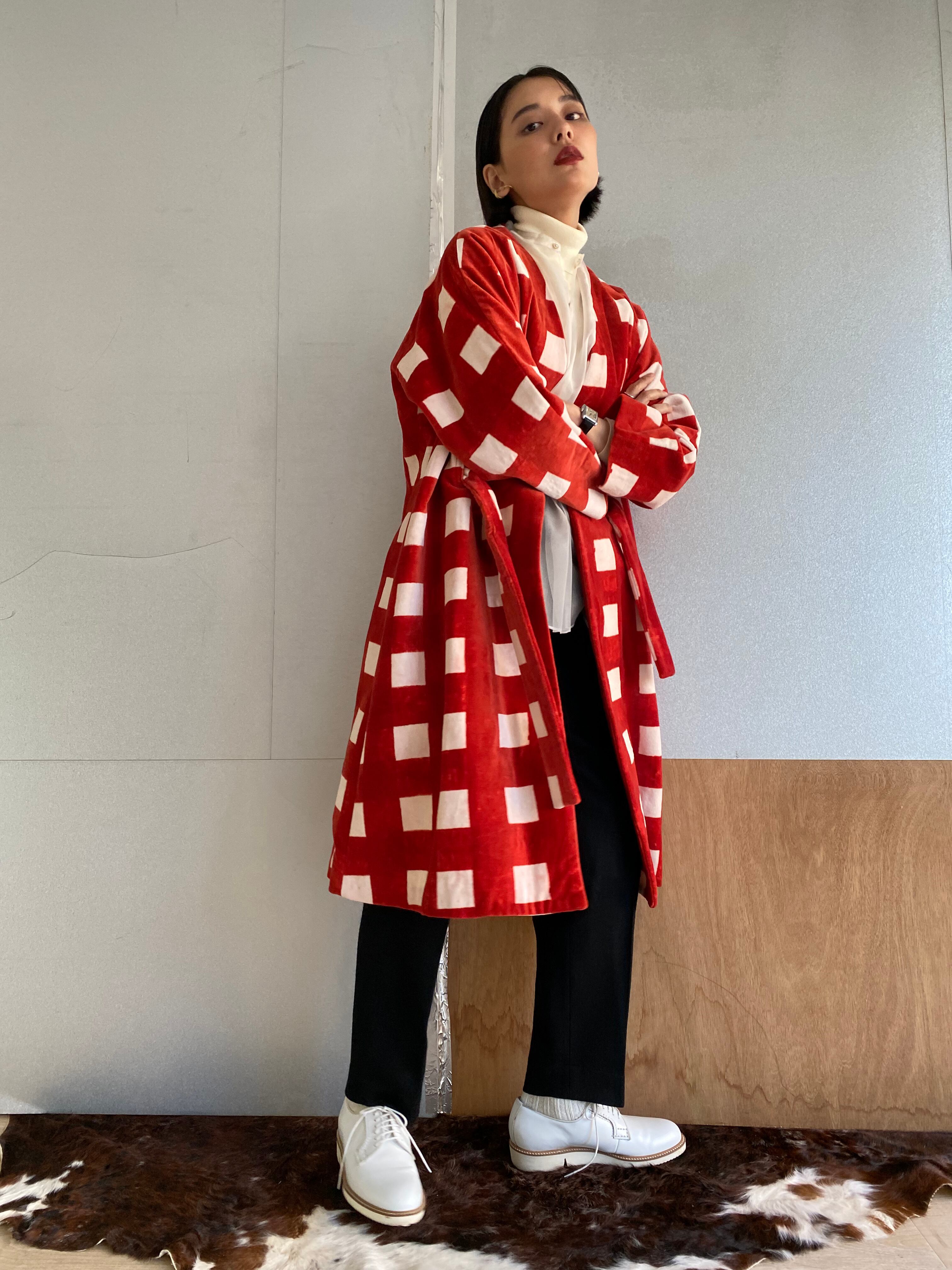 シンプルなデザインながら、ウエストのベルトが全体のバランスをグッと引き締めるコート。ベルトは裏地に通っているため、後ろ姿がすっきりします。ベルトを引く事で前身頃にタックが入ったようなラインが出て、独特の雰囲気を楽しんでいただけます。光沢感があるコットンベルベット生地が品の良さを感じさせます。