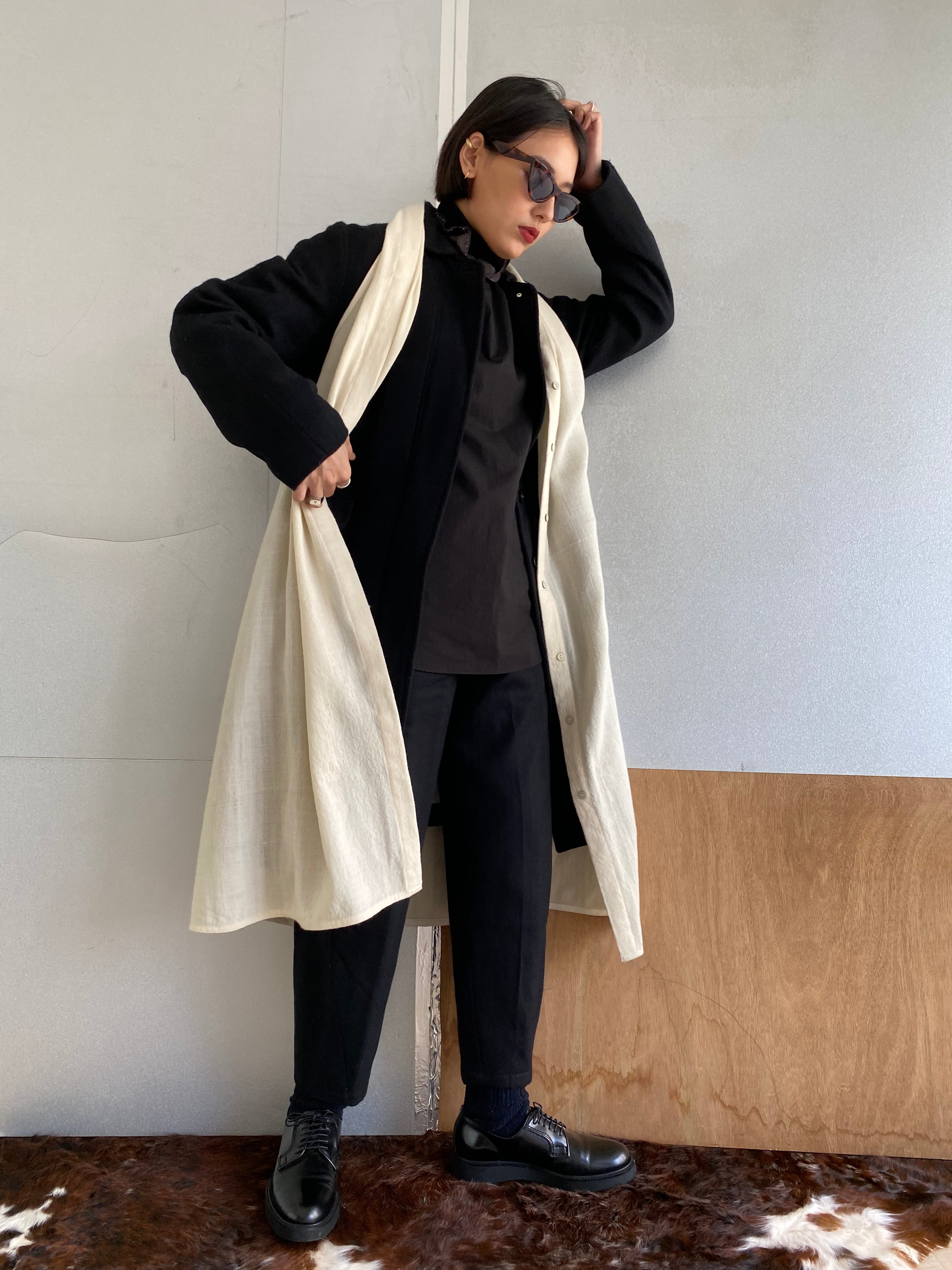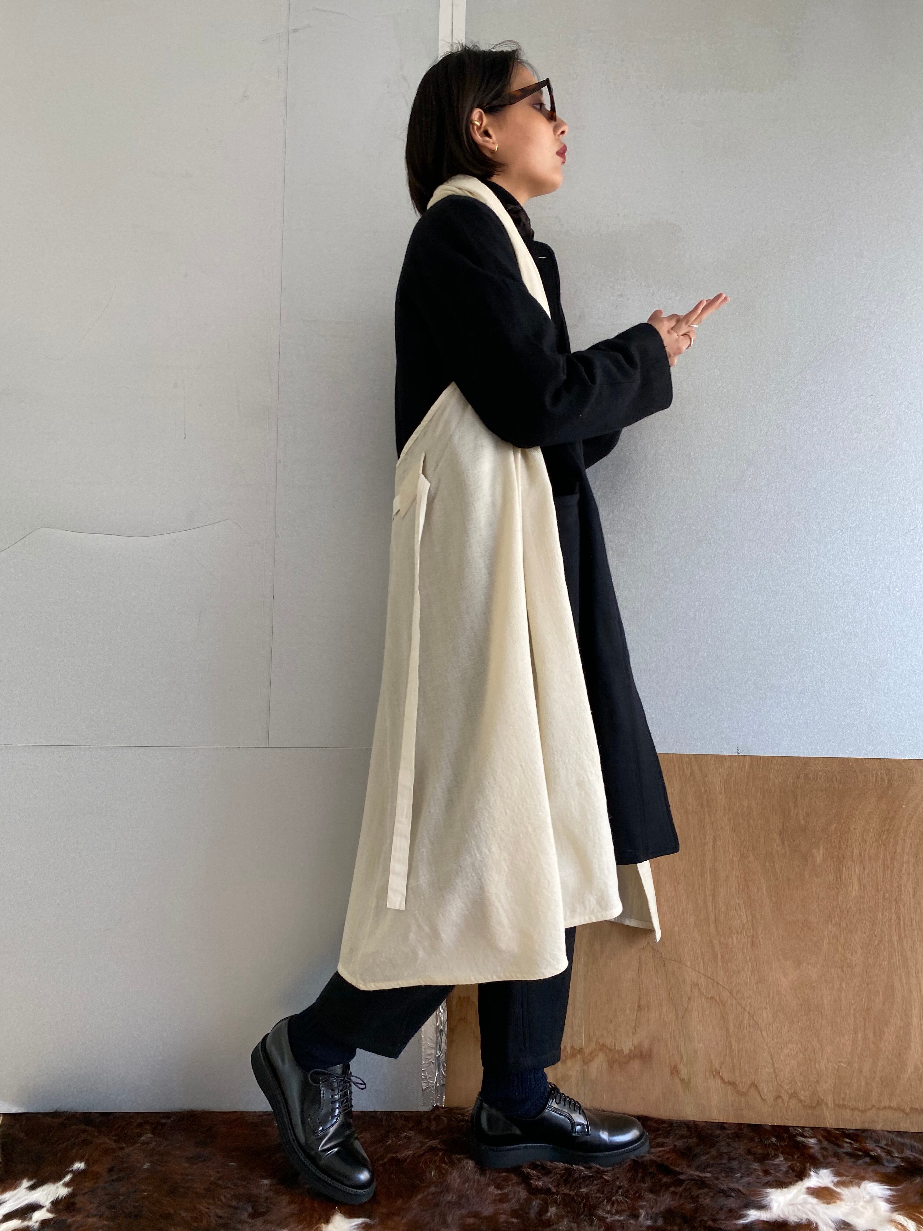 柔らかな光沢のある手織りのウールでお作りした、ホルターネックドレス。シンプルなシャツやワンピースと合わせてたのしめます。フロントボタンは比翼仕立てで、前を開いてショールや、ベストのようにも着ていだけます。ウエストのリボンでマークしてハイウェストで着て頂く事もできます。Aラインのシルエットがスタイリッシュな一着です。