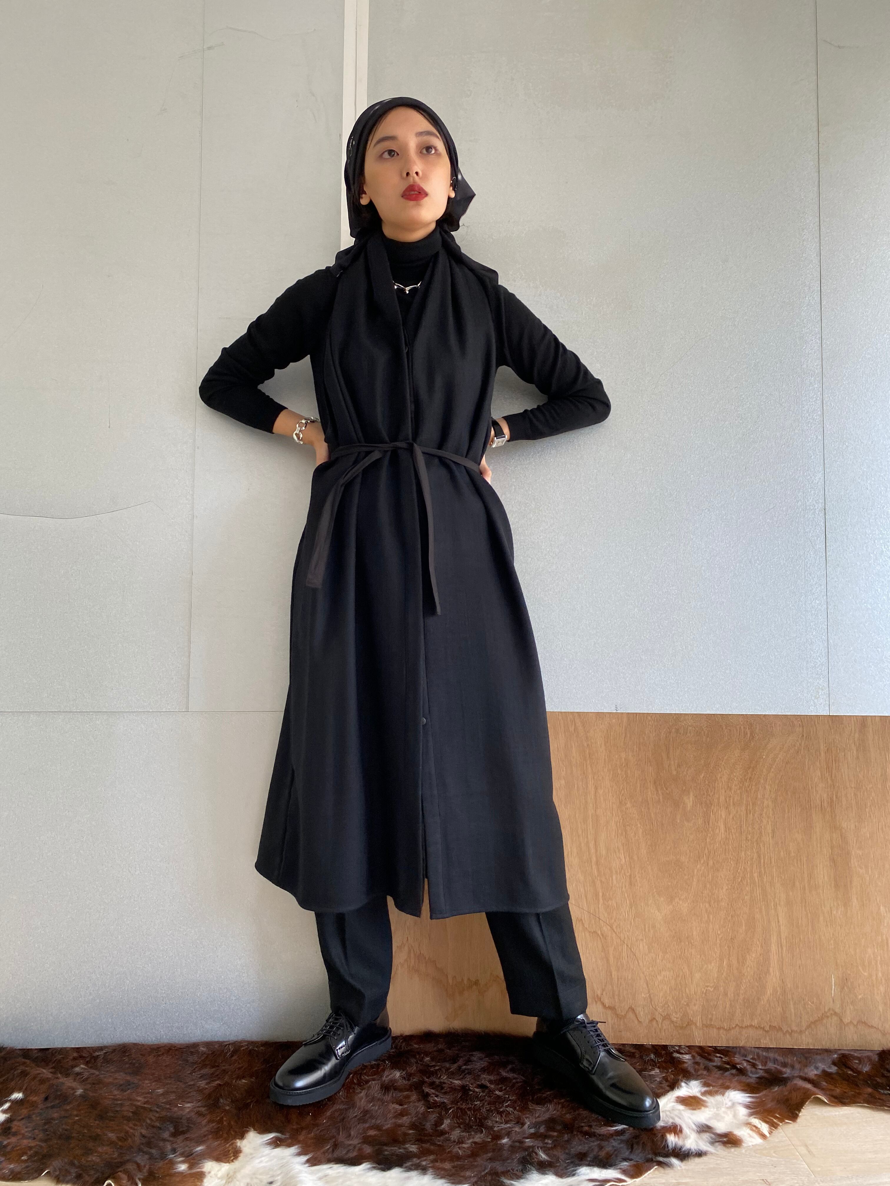 柔らかな光沢のある手織りのウールでお作りした、ホルターネックドレス。シンプルなシャツやワンピースと合わせてたのしめます。フロントボタンは比翼仕立てで、前を開いてショールや、ベストのようにも着ていだけます。ウエストのリボンでマークしてハイウェストで着て頂く事もできます。Aラインのシルエットがスタイリッシュな一着です。