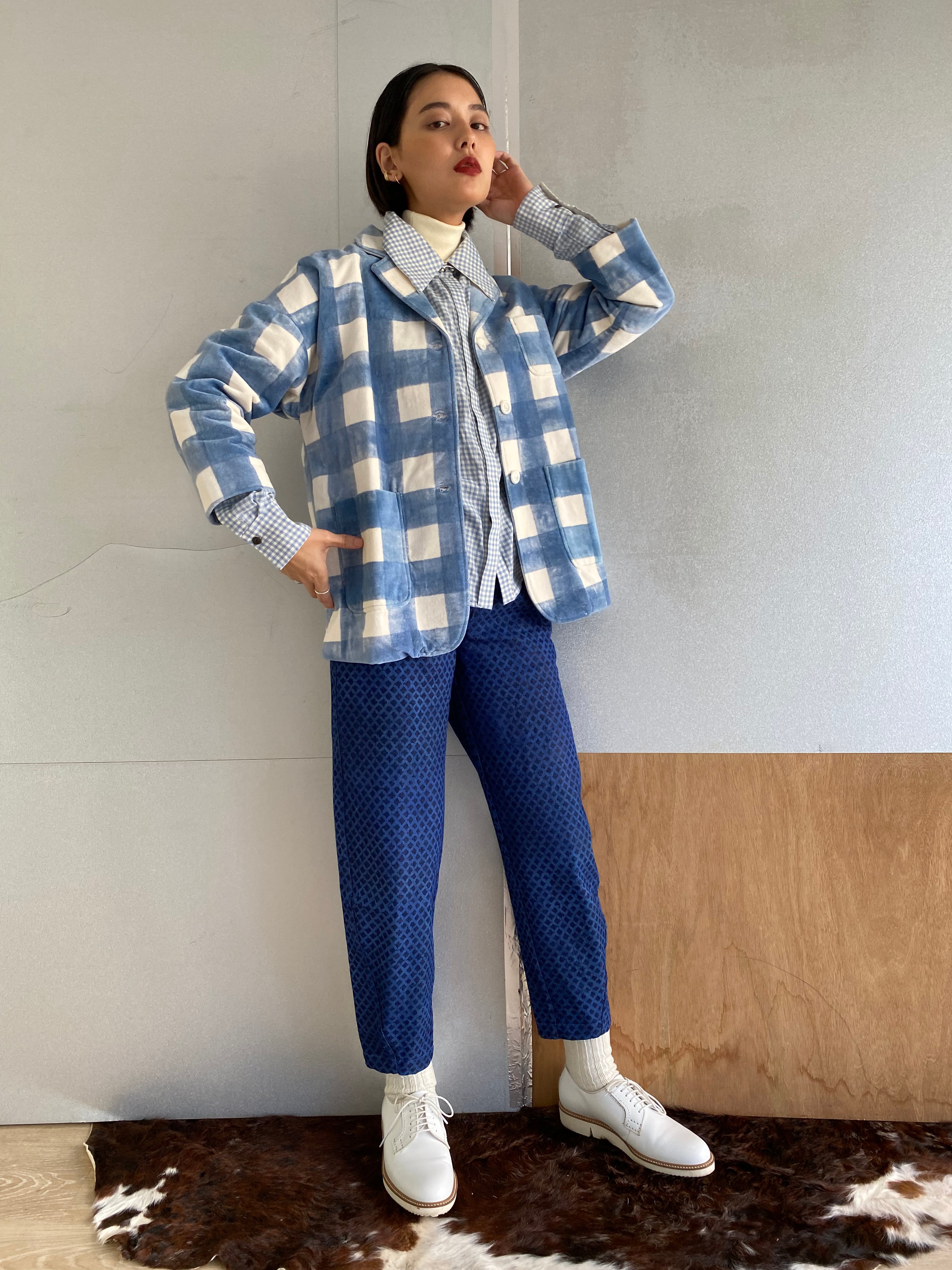 Drop shoulder jacket "block print big size gingham check blue" cotton velvet