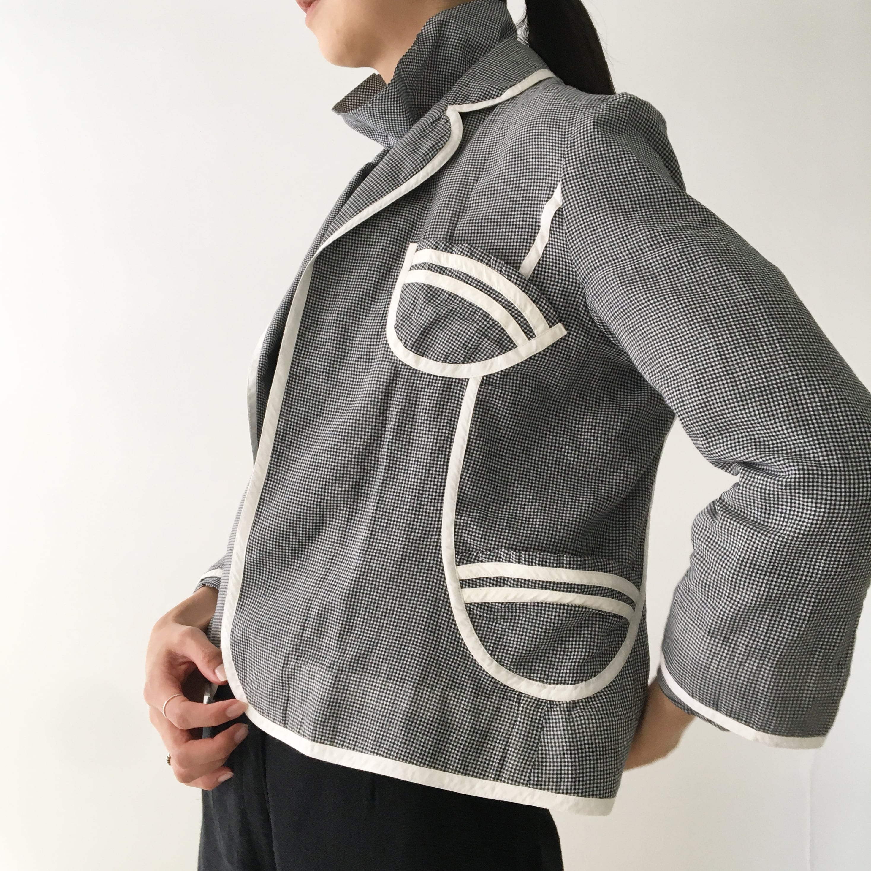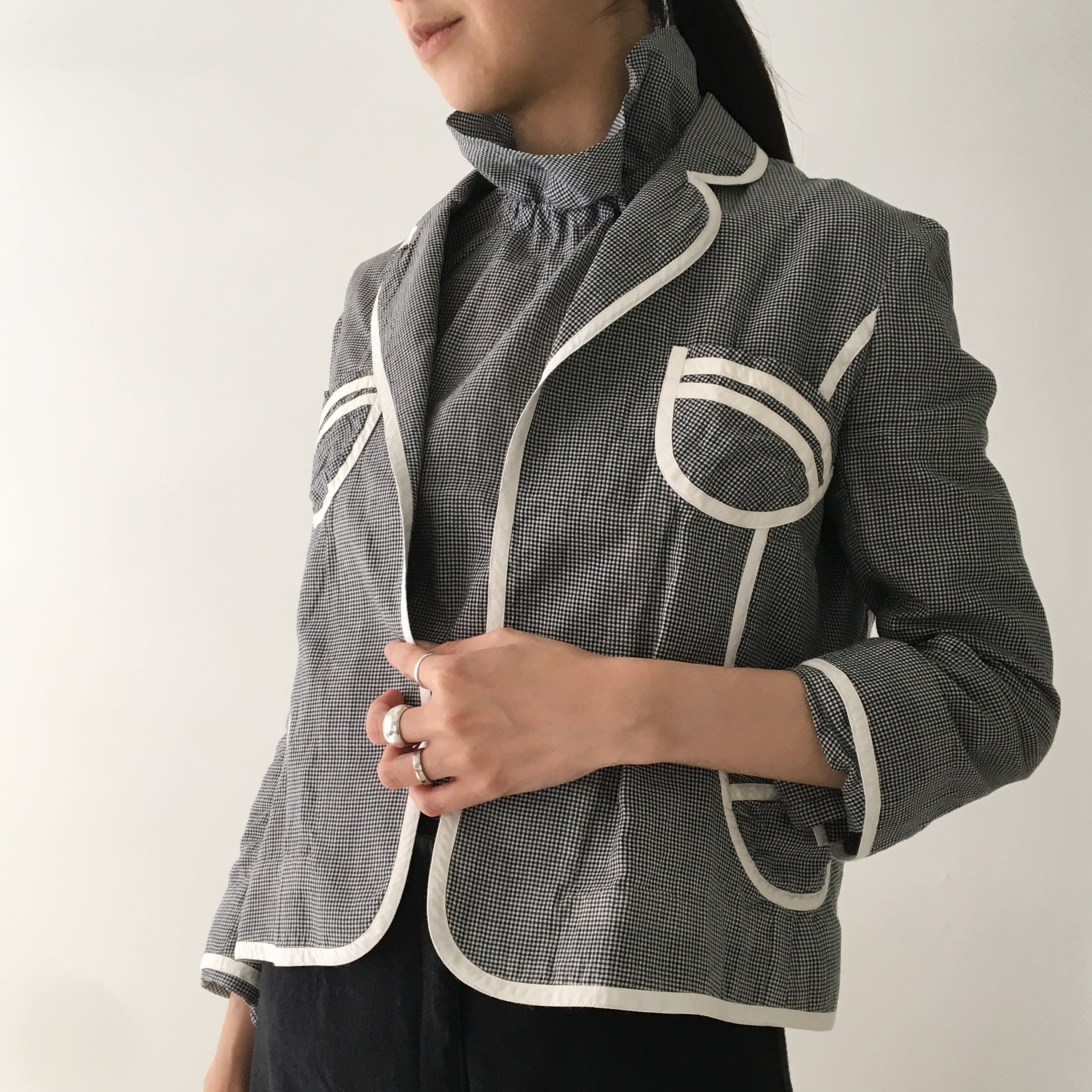 タイトなサイズ感のデザインジャケット。裏地のない一枚仕立てで着丈もコンパクトですので、軽やかに羽織っていただけます。細部まで丁寧にパイピングが施されており、アクセントになっています。黄色がさり気なく映える先染チェック柄のカディリネンを使用しており、程よいハリ感と通気性を感じていただけます。