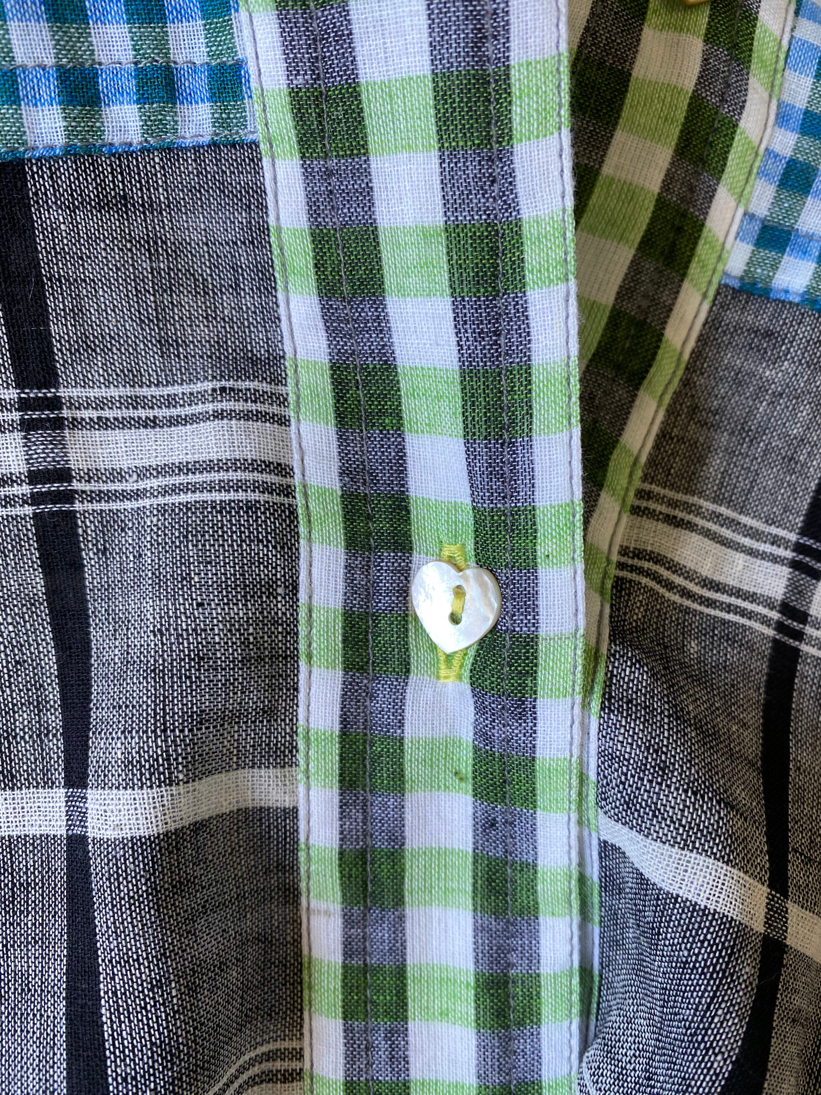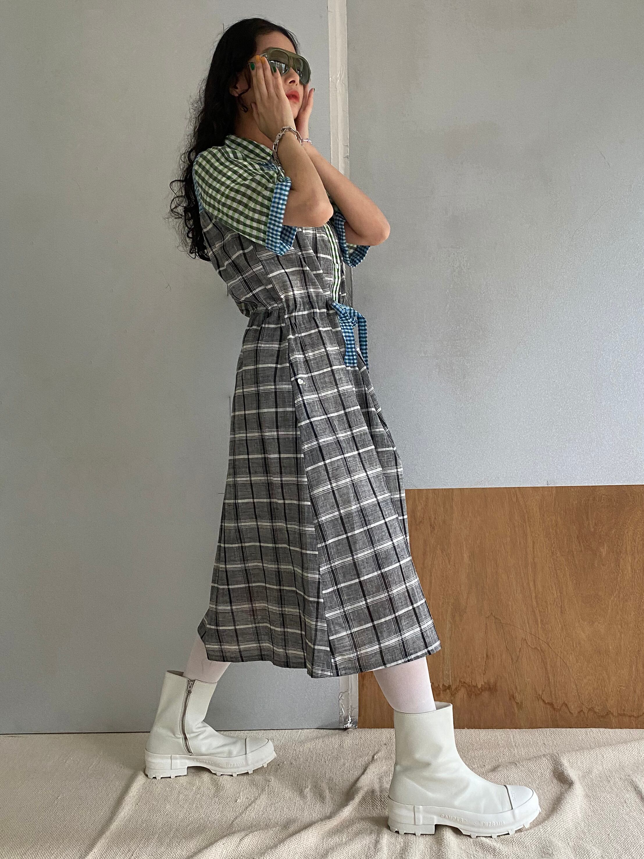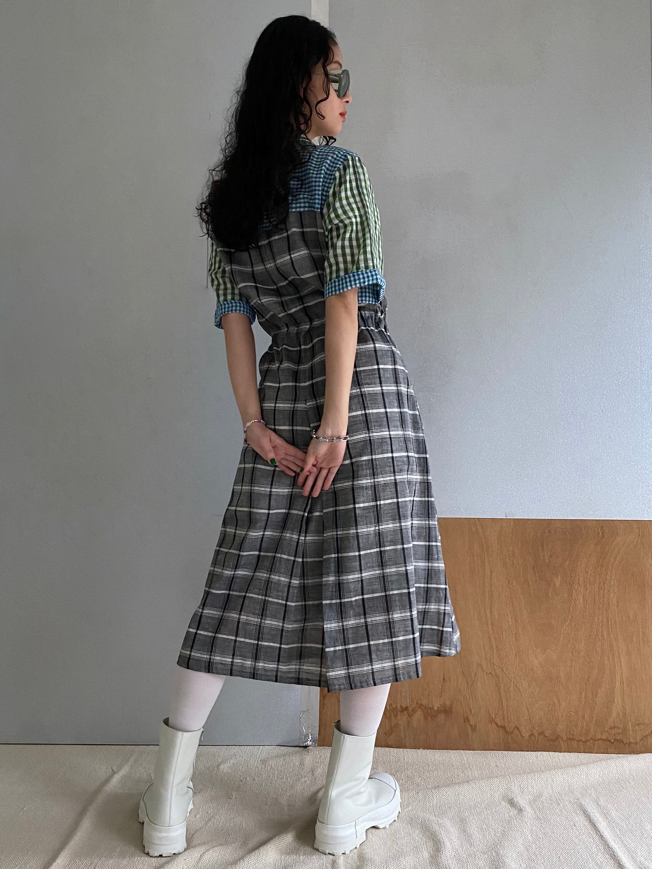 Like a vintage dress "green & black check"khadi cotton