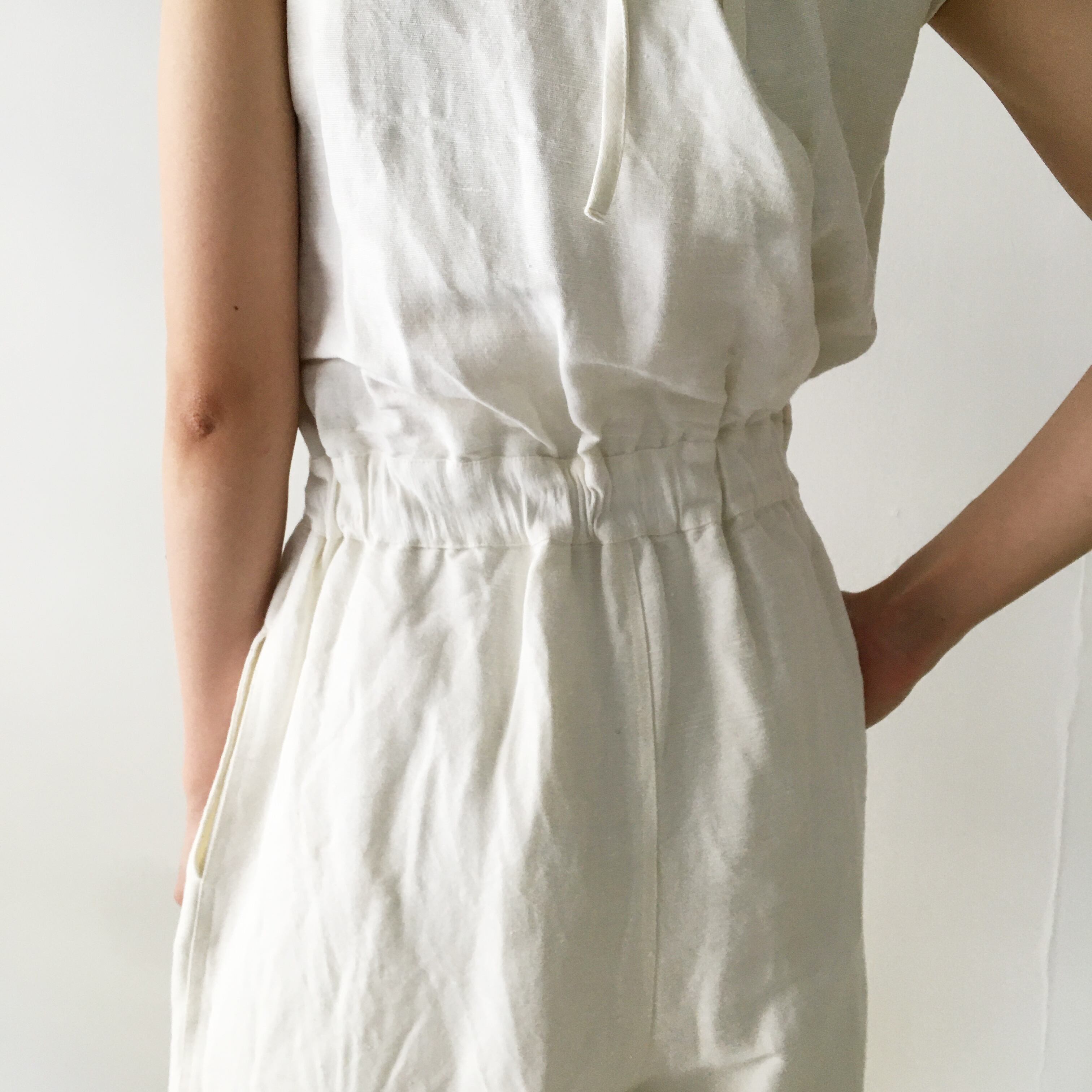 ヘルシーな印象ながらも品よくまとめたオールインワン。 ハイウエストで、バランス良く着こなしていただけます。見頃中心胸元にはダーツが入っており、アクセントに。 バックサイドは V 字開きでリボンでの調節可能。身頃はややタイトめですので、真夏は一枚でさらりと着るのはもちろん、羽織との組み合わせもおすすめです。カディコットンの柔らかな質感がさらりとしていて肌に心地よいです。