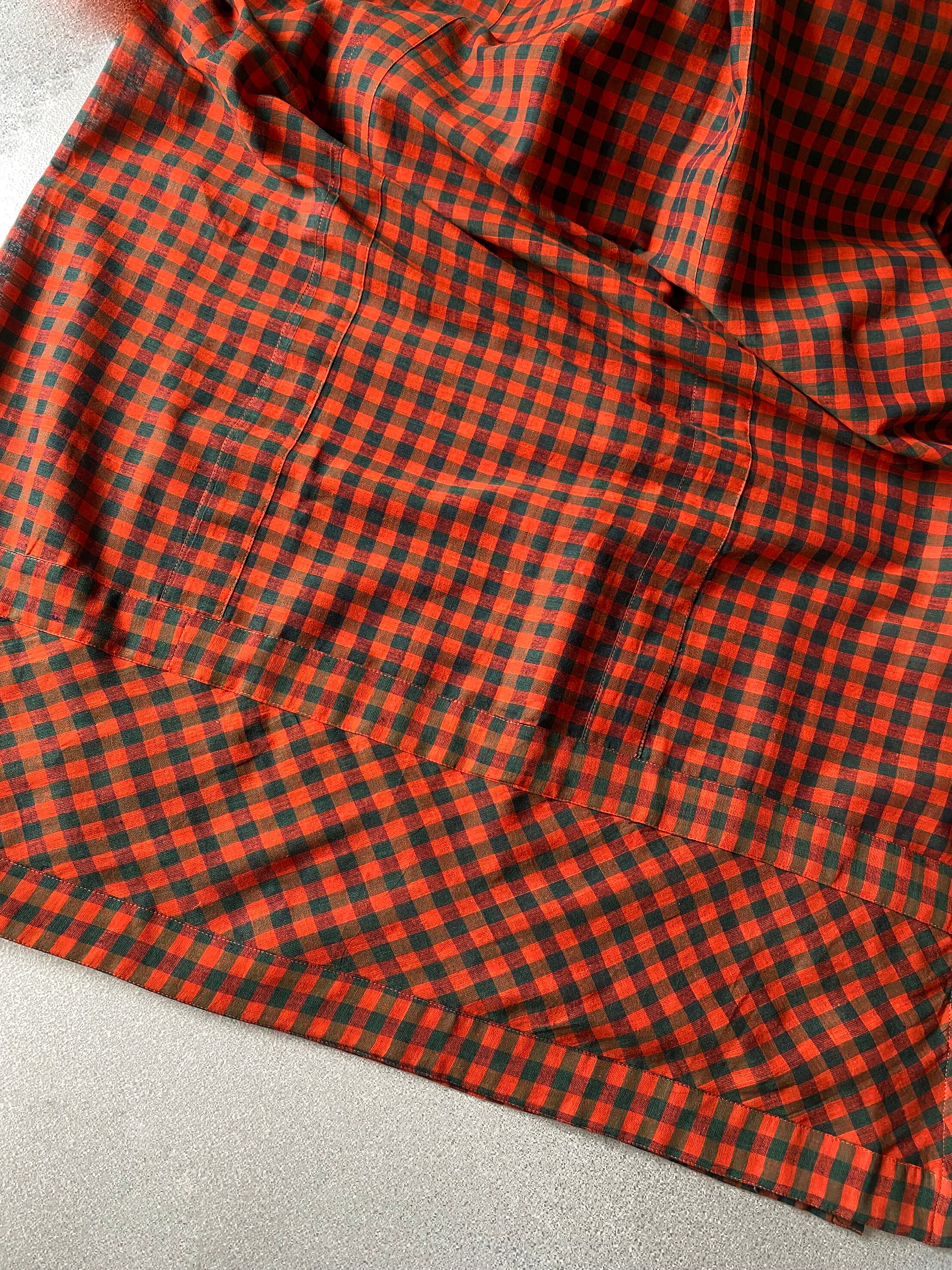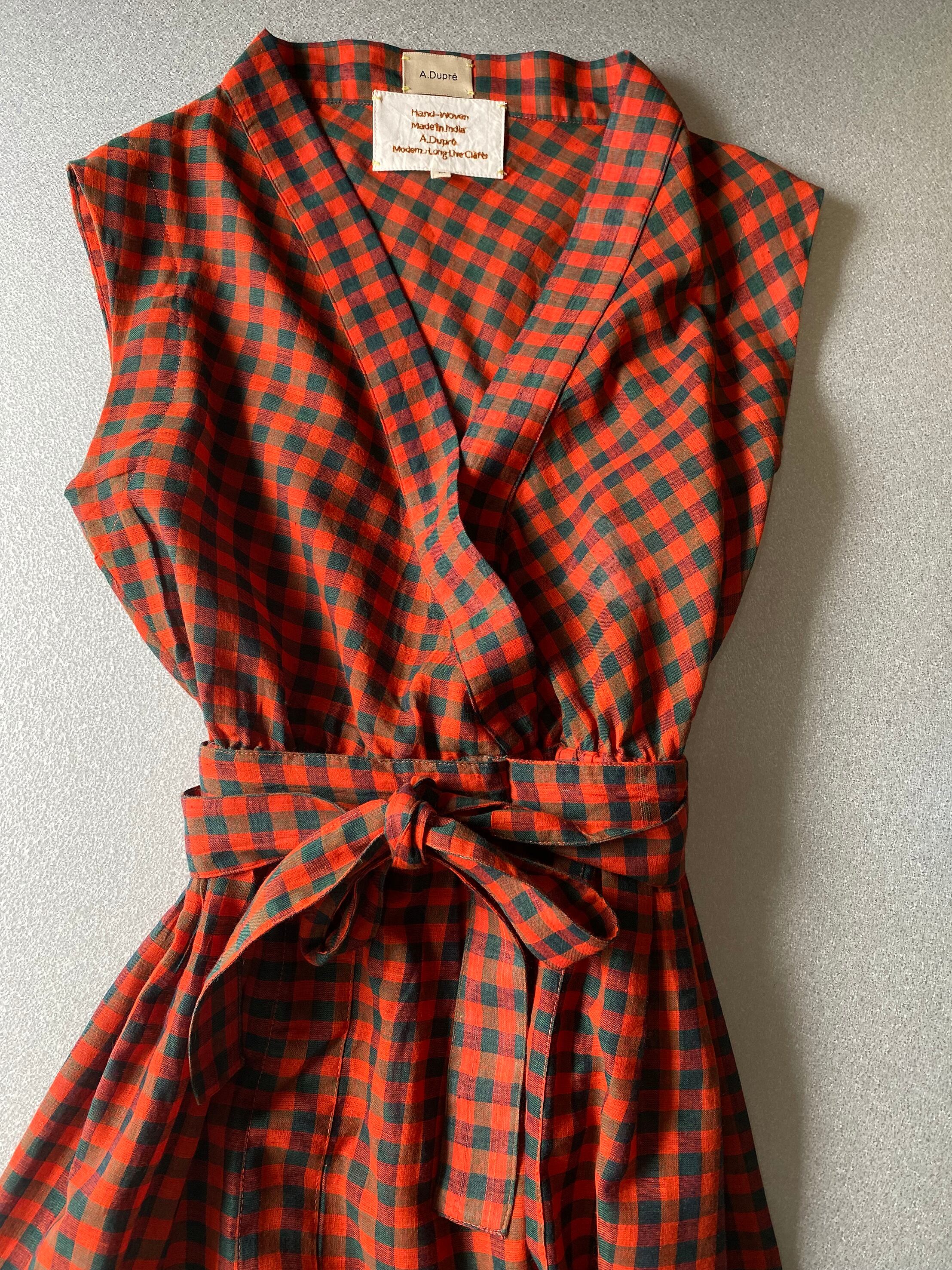 Deep v-neck long dress "red & deep green check" khadi cotton