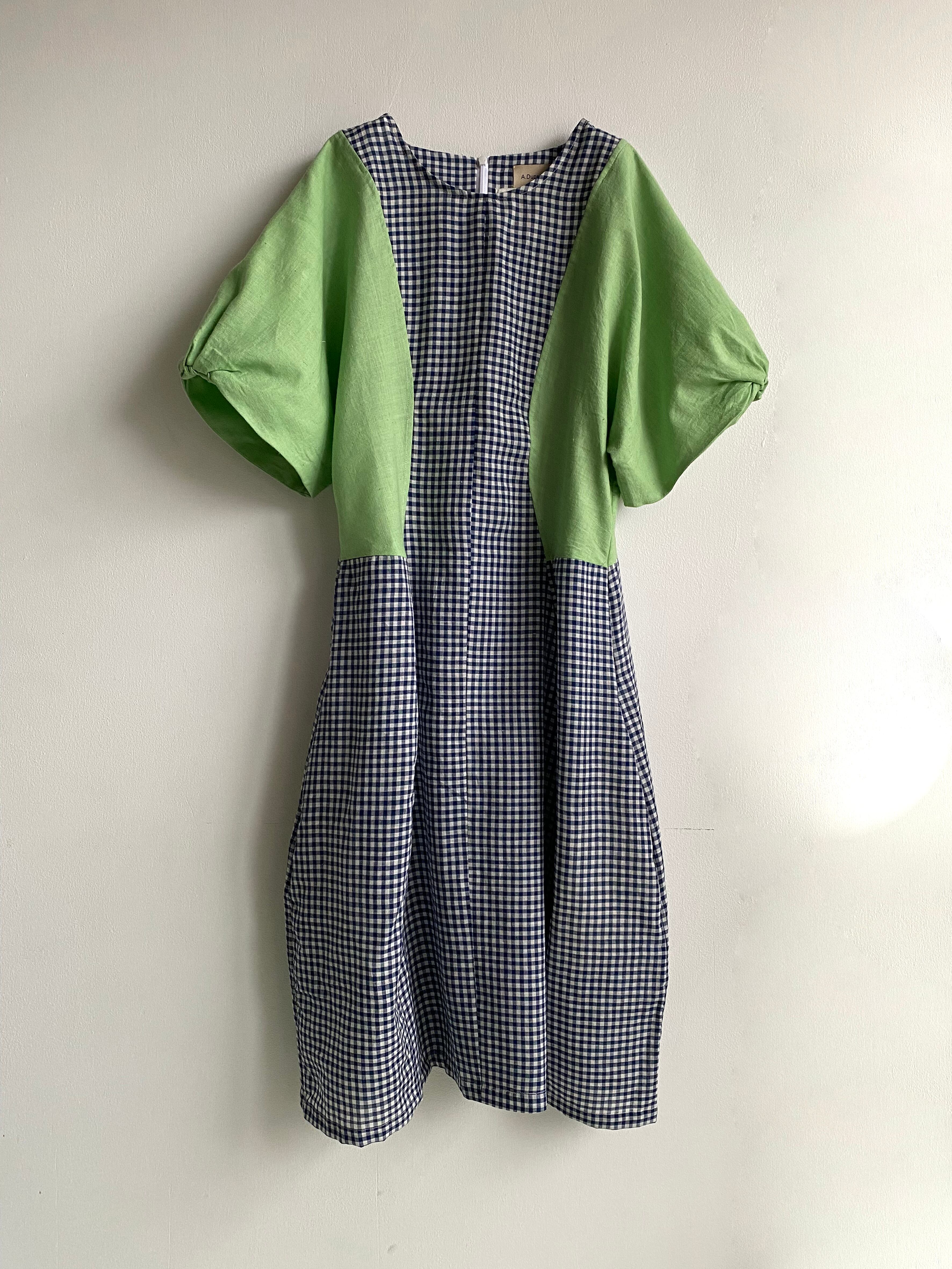 袖のパターンのあしらいが特徴的なショートスリーブドレス。クラシカルなギンガムチェック、太めの袖に比してグッと細くシェイプされたウエストラインのフェミニンさ。柔らかい肩のラインと、肩袖にかけてほどよくゆったりとしたサイズ感。柔く軽い張りのあるコットン素材を使用。淡く鮮やかなライトグリーンとダークネイビーギンガムチェックの切り替えが華やかさを添えます。