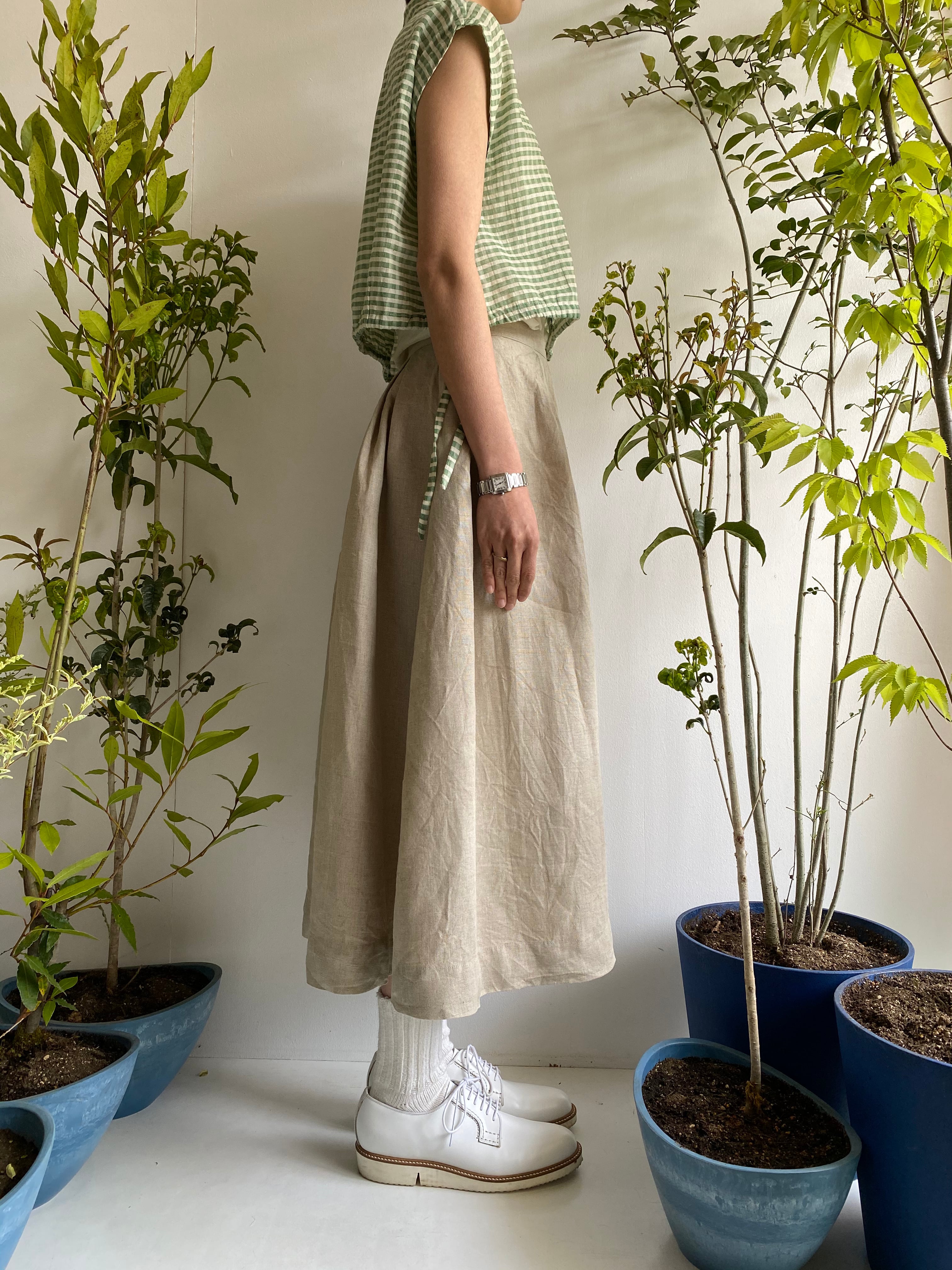 フレンチスリーブトップ。肩が少し隠れます。袖、襟の裏地、リボンがシルクになっており、光沢が上品な印象。裾のリボンを絞ることでウエスト周りを調節できます。裾をタイトに絞ることで肩周りのゆとりあるシルエットとウエストを絞った対比がシャープでおすすめの着方です。透け感のある、手織りのコットンチェックの質感が、夏でも心地よく感じさせてくれます。丈が短めなのでハイウエストパンツと相性がいいです。インドの職人による手織りの生地を使用しています。カジュアルな印象の素材をモダンで上品な服に昇華させたデザインは、手仕事の形跡を際立たせ、着る人にリラックスしながらも上質な日常をもたらします。