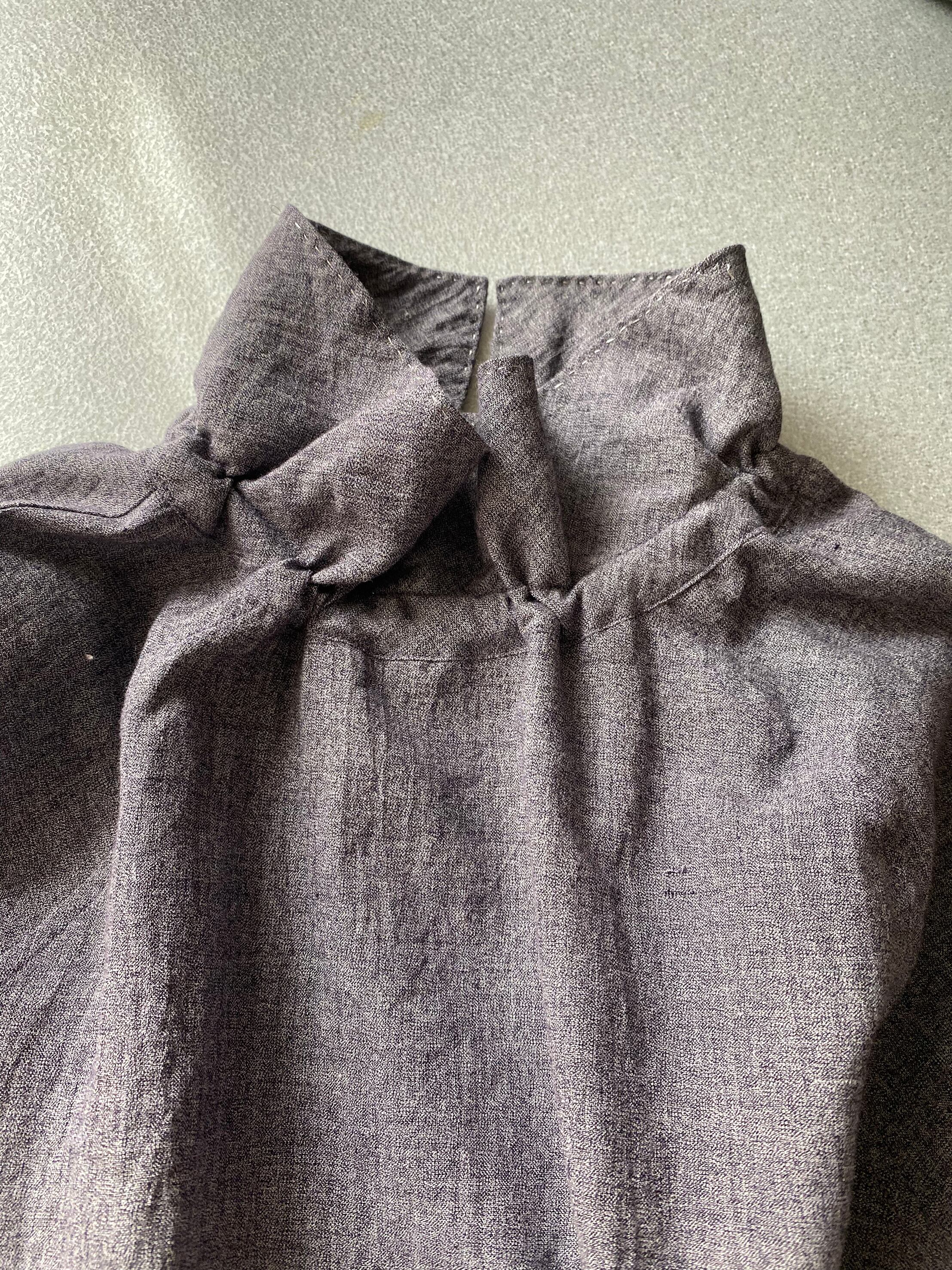 ゆったりとしたサイズ感のハイネックブラウス。長めのネックはリボンでギャザーを寄せたり、折って寝かせたりとスタイリングにより表情の変化を楽しめます。長めの着丈はボトムに入れ込む着こなしなど様々なコーディネートにお使いいただけます。ハリがありながらも薄手の生地感ですので、セーターの下などへの重ね着も可能です。襟とカフスにはシルバーの糸でハンドステッチが施されており、さり気なく煌めきます。