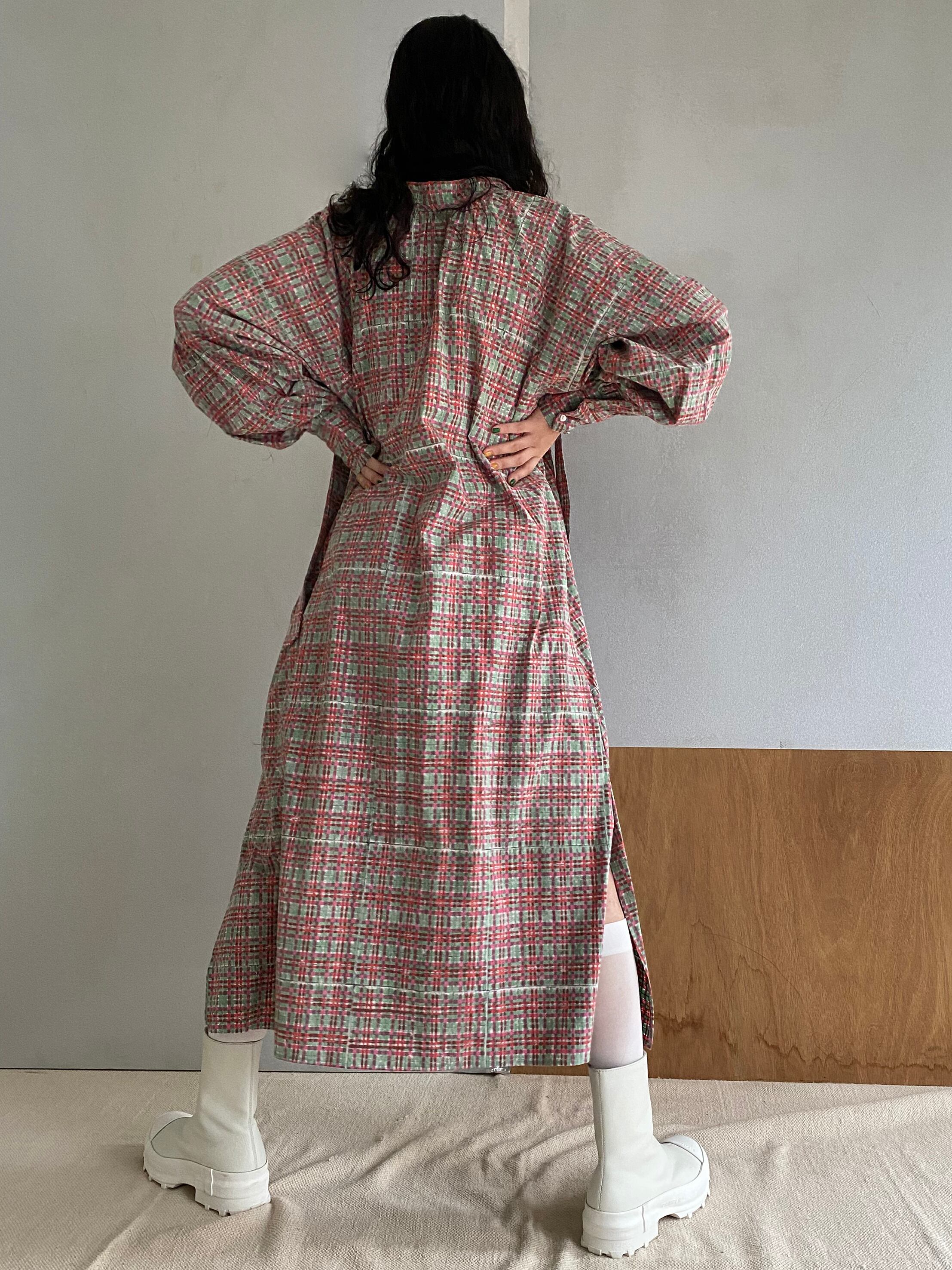 Two way raglan sleeve bow tie long dress "block print red & green check" organic cotton