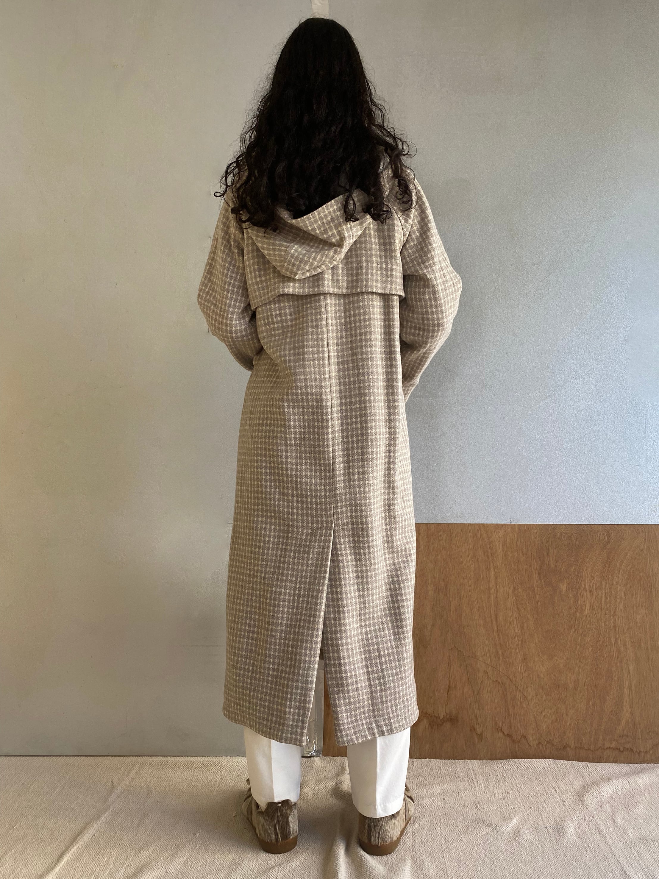 Raglan sleeve fooded coat "Ice gray hound's-tooth check"khadi wool