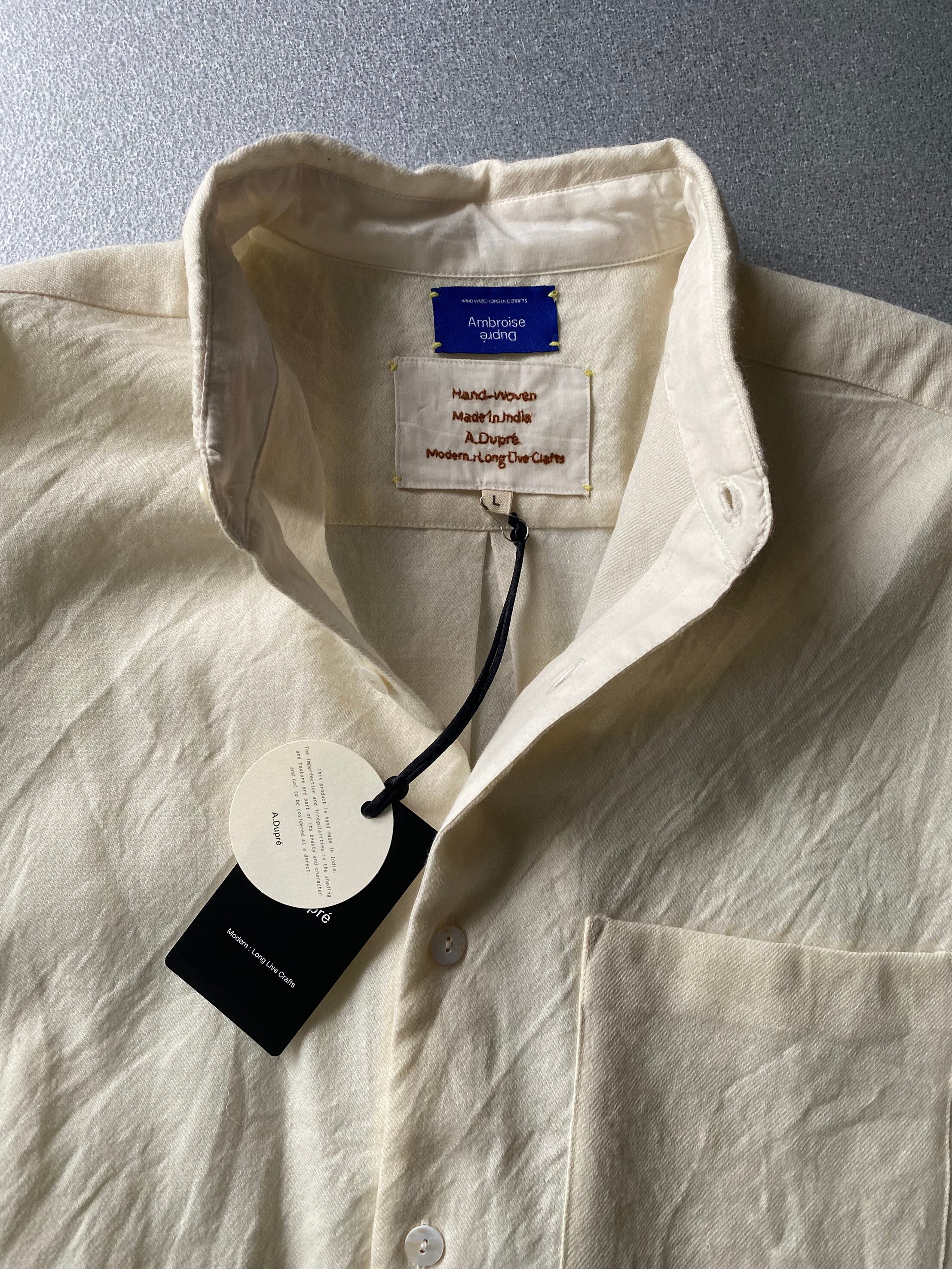 オーソドックスなユニセックスシャツ。薄手で軽い、カディコットンならではの柔らかさが肌に優しいです。 生地がしなやかですので、女性が肩を落として着ても素敵なシルエットになります。貝ボタン使用。