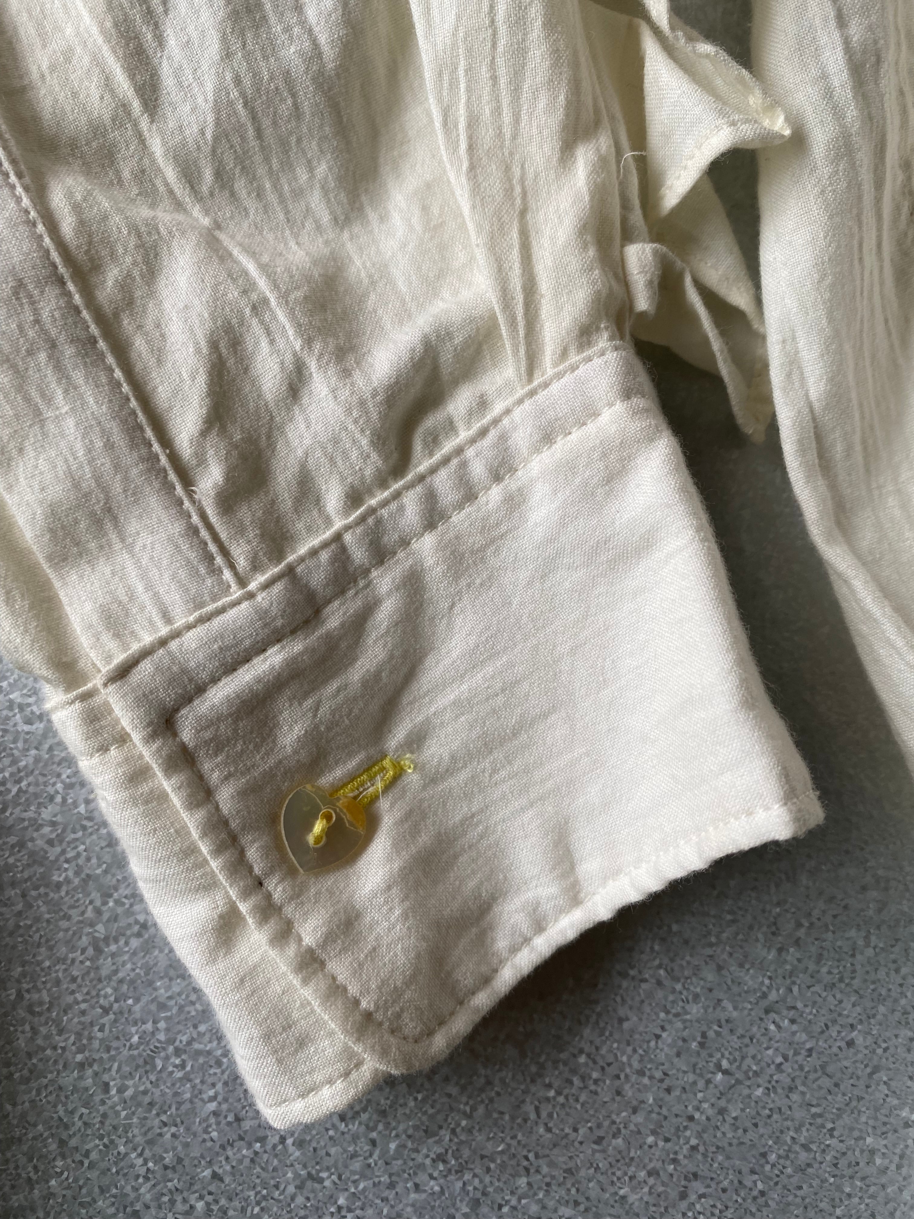 見頃に程よいゆとりがあり胸元に縦横方向ともにシャーリングを施した、ファニーながらも上品な印象のラッフルブラウス。袖に立体的なフリルが付属しています。コンパクトでメンズライクな襟。襟、カフス、前たては機械織オーガニックコットンのタイプライタークロスを使用。前立て比翼仕立て。ハートモチーフ貝ボタン。