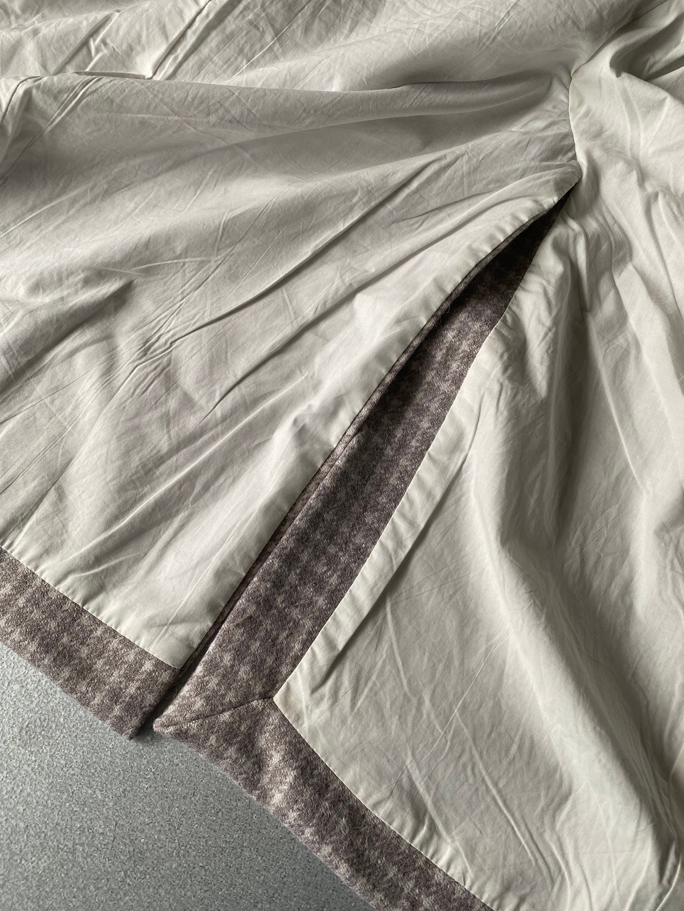 2種のスリーブデザインを採用したコート。前袖はセットインスリーブ、後ろ袖はラグランスリーブにてお作りしており、肩のラインを強調しすぎず華奢な印象に。裏地には機械織オーガニックコットンタイプライターを使用。しっかりと目の詰まった手織のウールと程よい張りを兼ね備えたオーガニックコットン生地でしっかりとした仕上がり。